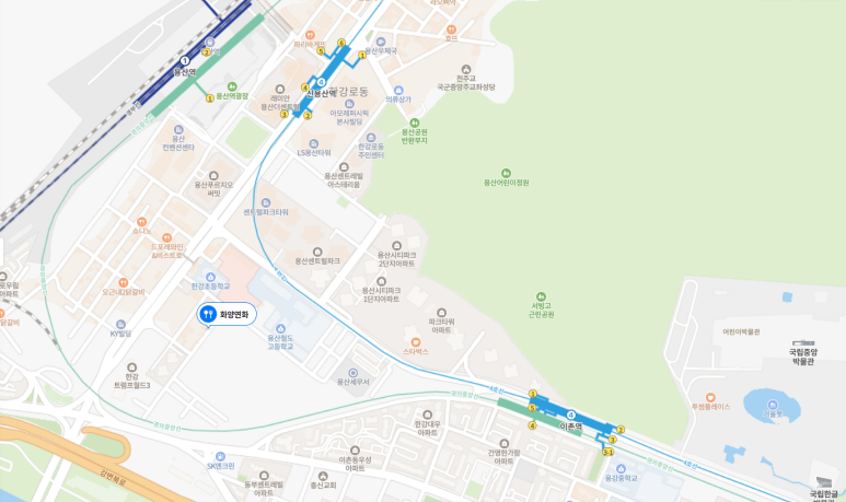 지하철 4호선 이촌역 5번 출구, 신용산역 2번 출구에서 600 ~ 800m로 도보 8 ~ 10분 거리입니다.