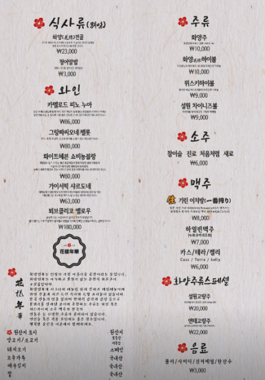 현재 네이버에서 "화양연화"를 검색해서 들어가신 후 "알림받기 동의"를 누르시면 위스키 하이볼 1잔 쿠폰을 제공하는 이벤트를 하고 있는 듯 합니다.