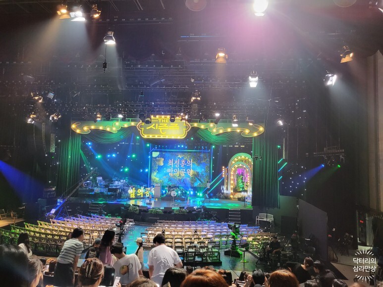 18시 경(제가 갔을 때는 18시 20분 경) 부터 입장이 시작되는데, 우선 지정석 관객들이 착석하면, 그 뒤에 입장번호 앞 번호 자유석 관객들이 입장하고(보통은 무대 맨 앞자리 또는 무대 우측의 MC 대기석 앞자리가 명당이라 먼저 찬다고 하네요.) 무대 앞자리에 있는 간이 좌석부터 착석하게 됩니다. 무대 앞의 간이좌석이 다 채워지면 지정석의 side에 있는 자리나 지정석 사이사이의 빈자리에 자유석 관객이 착석하고, 그 후에도 자유석 관객이 남으면 지정석 좌석의 복도 계단에 깔개를 깔고(제작진이 지급함, 당연히 추후 반납해야 합니다.) 앉게 됩니다.