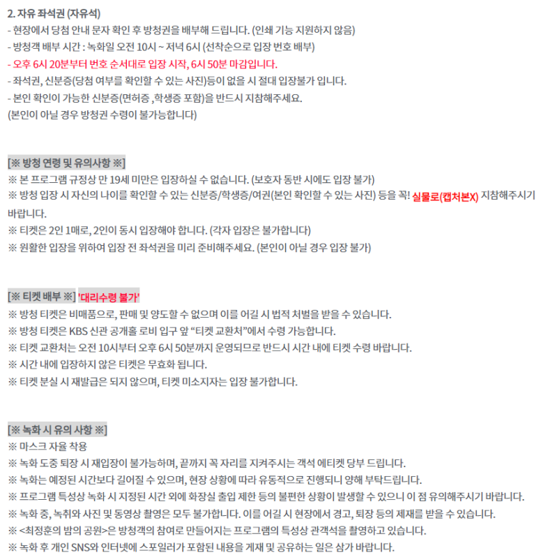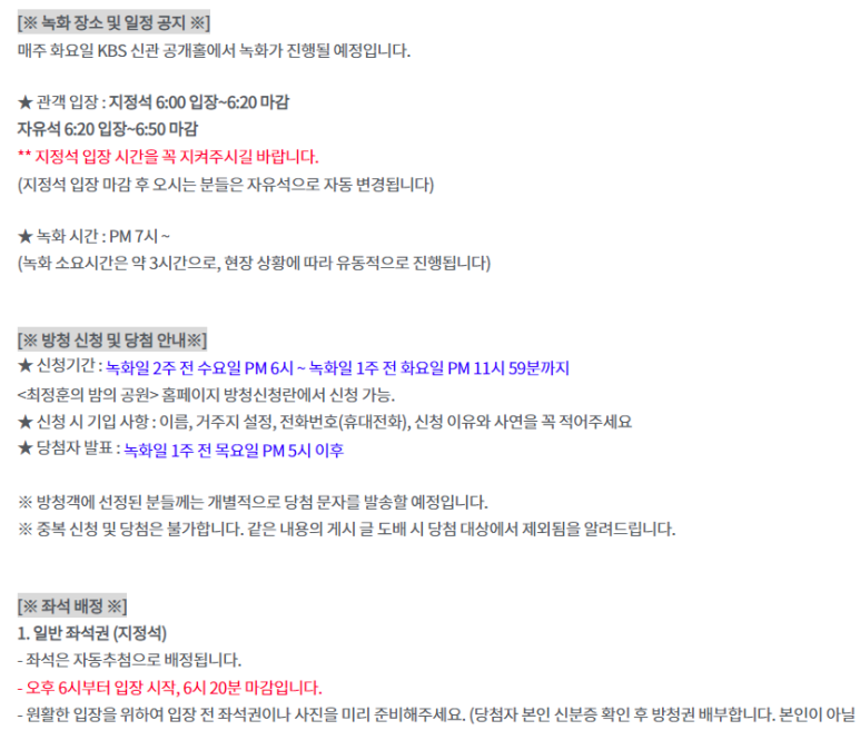 이미 좌석이 배정되어 있기에 KBS 아트홀에 일찍 오실 필요는 없습니다.