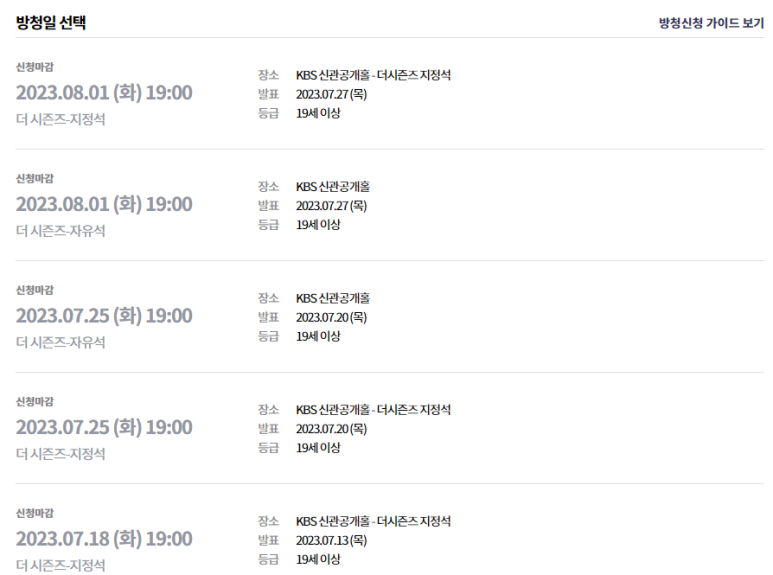 현재는 8/1일 방청신청이 마감되어 방청신청 메뉴가 뜨지 않습니다. 다음 녹화 예정일인 8.7일(화) 녹화 일정이 확정되면 "방청신청" 메뉴가 뜨시면 클릭하시고 신청하시면 됩니다.