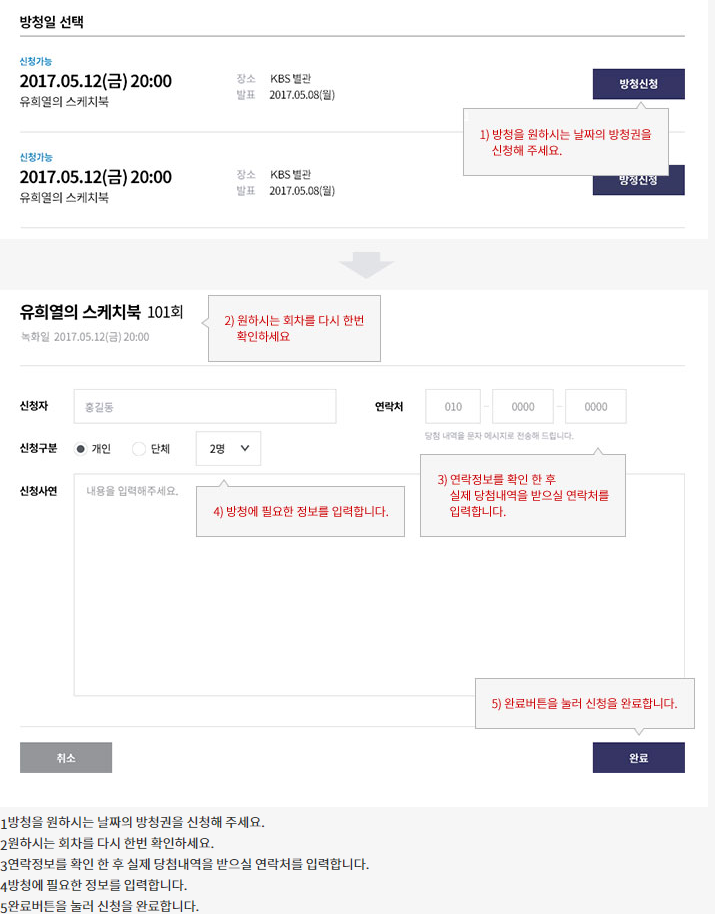 당첨자발표는 녹화 1주전 목요일 17시 이후에 실시됩니다.(문자로 날라옵니다.)