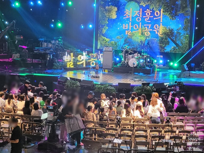 무대 밑 우측에 보이는 흰색 벤치가 MC인 최정훈씨가 앉아서 대기하는 자리입니다.(뮤지션들이 노래할 때)