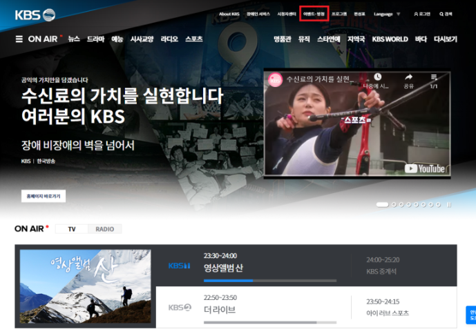 KBS 메인 홈페이지를 보시면 상단에 [이벤트, 방청]이라는 메뉴가 있습니다.