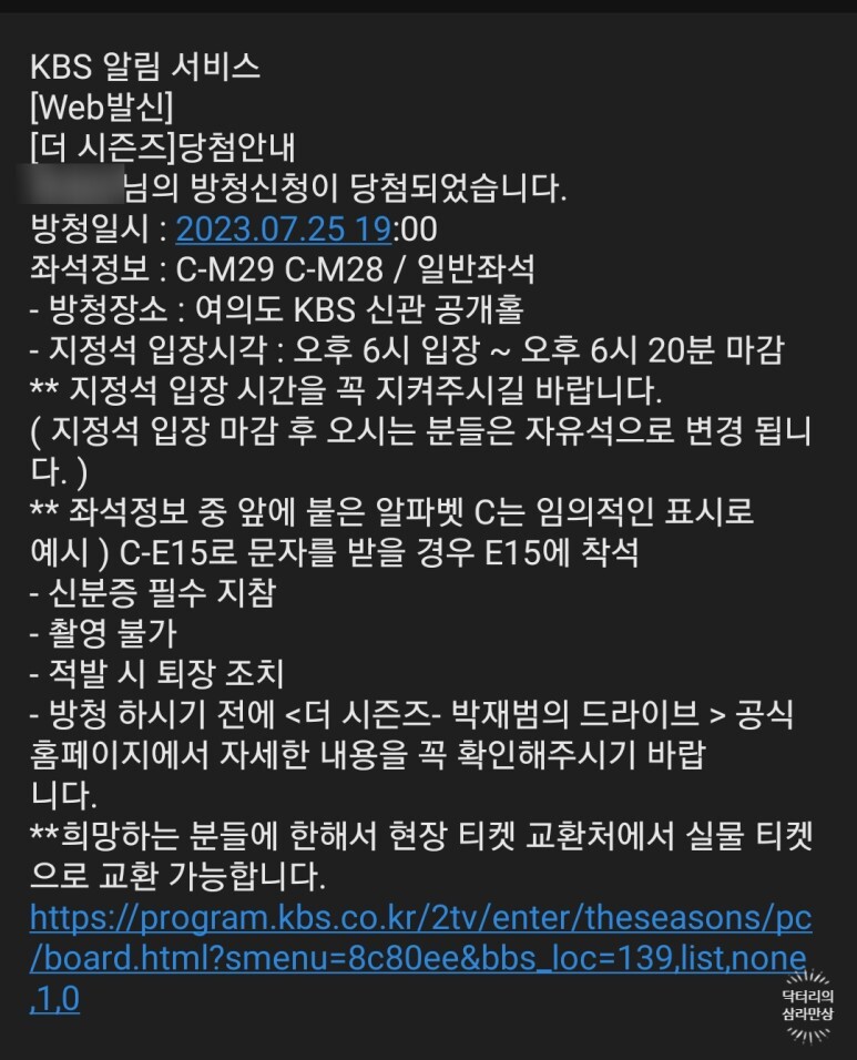 그때의 기억이 제게는 좋은 기억으로 남아있기에, 이번에는 조금 더 경쟁이 높을 것으로 예상되는 KBS 더시즌즈, 최정훈의 밤의공원에 방청신청을 도전했습니다.
