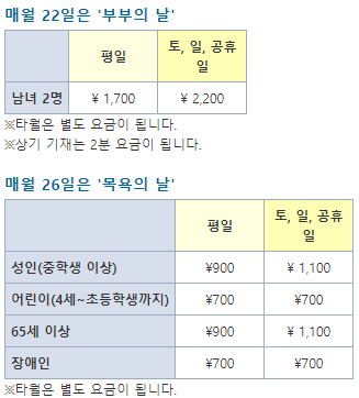 특이하게 매월 22일은 부부의 날로 남여2인 1700엔(평일)과 2200엔(토,일,공휴일)으로 할인을 해주고 있고, 매월 26일은 목욕의 날로 역시 할인을 해주고 있습니다.