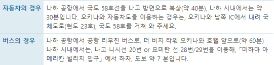 렌터카로 가실 경우 나하 공항에서 58번 국도를 타고 북쪽으로 40분, 나하 시내에서는 약 30분 정도 걸립니다. (네비게이션용 맵코드-MAP CODE-는 33 525 117*37 입니다.)