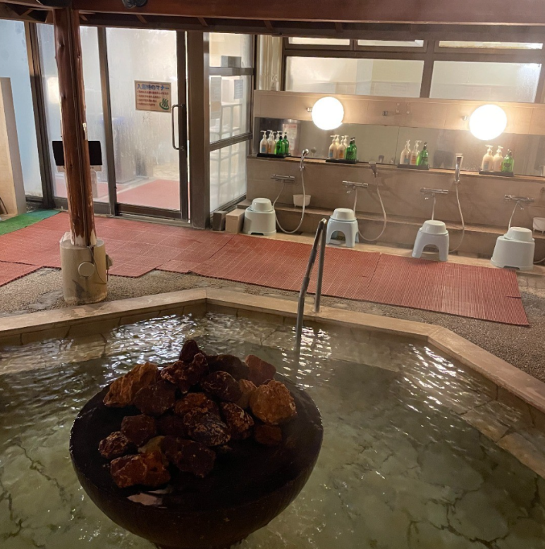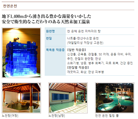 단순히 온도가 높은 물이 아니라 지하 1400m에서 끌어올린 온천수를 사용한다고 합니다. 나트륨-탄산수소염 온천으로서 약알칼리성 저장성 고온의 온천으로 물을 만지면 미끌미끌 거립니다. 목욕하고 나오니 피부가 매끄러워진 느낌이 확실히 있었어요.