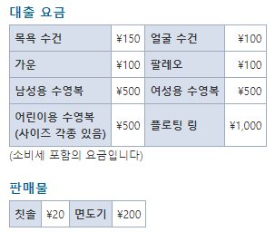 빌리시려면 목욕용 큰 타월은 150엔, 작은 얼굴용 수건은 100엔입니다.