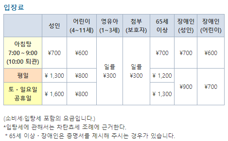 아침탕(7시 ~ 9시)만 이용하실 분들은 성인 700엔, 어린이 600엔, 영유아 300엔에 이용하실 수 있습니다.