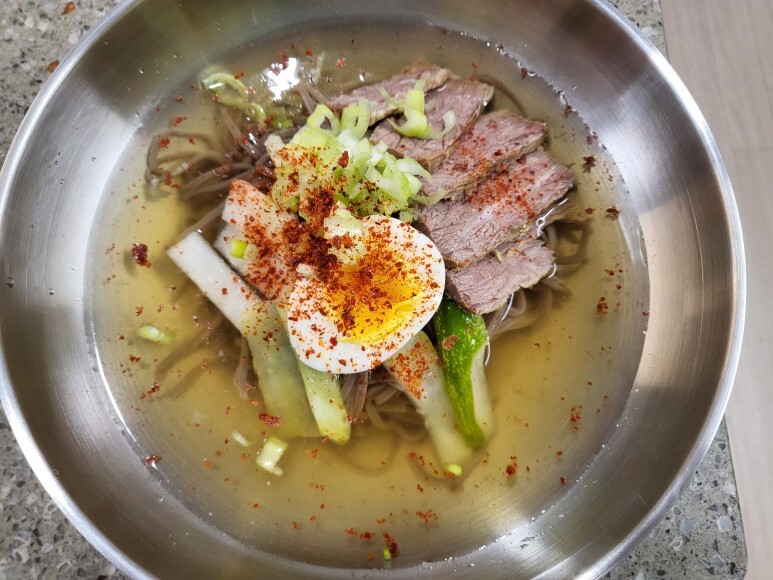 우선 생메밀면(없으시면 건메밀면도 좋습니다.)을 삶은 후 찬물에 헹궈서 준비해서 냉면그릇에 넣고, 육수를 붓습니다. 그 위에 무와 오이, 삶은 계란 반개를 올리고, 어제 식혀둔 양지를 얇게 썰어 고명으로 올립니다.