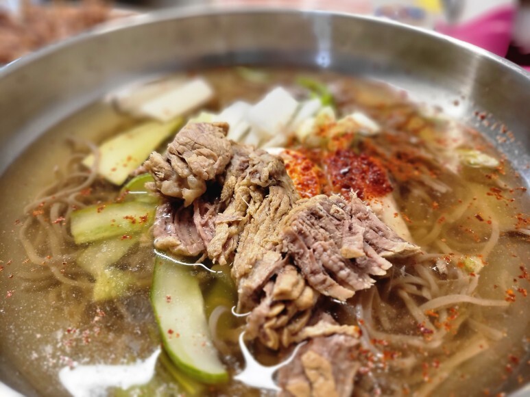 그럼 맑은 육수가 나오는데, 딱 평양냉면의 그 색입니다.