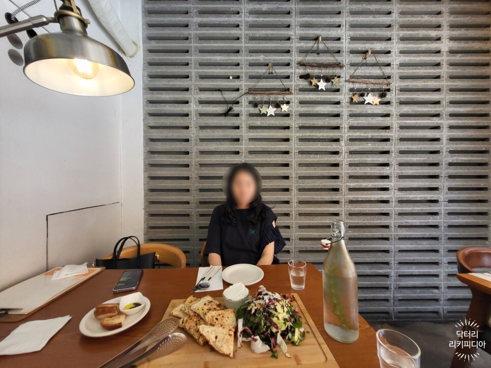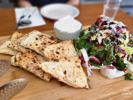 일단 밀가루 반죽으로 만든 난?도우?빵?이 정말 쫄깃하고 맛있습니다. 여기에 샐러드(치즈와 발사믹 소스가 들어있습니다.)와 시럽으로 코팅된 호두, 그리고 수제 리코타 치즈(수제가 분명합니다. 왜냐하면 제가 만들었을 때처럼 흐물흐물했기 때문입니다. ㅎㅎ)를 넣어먹으니 정말 맛있네요.